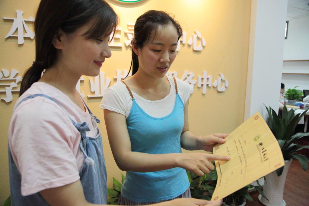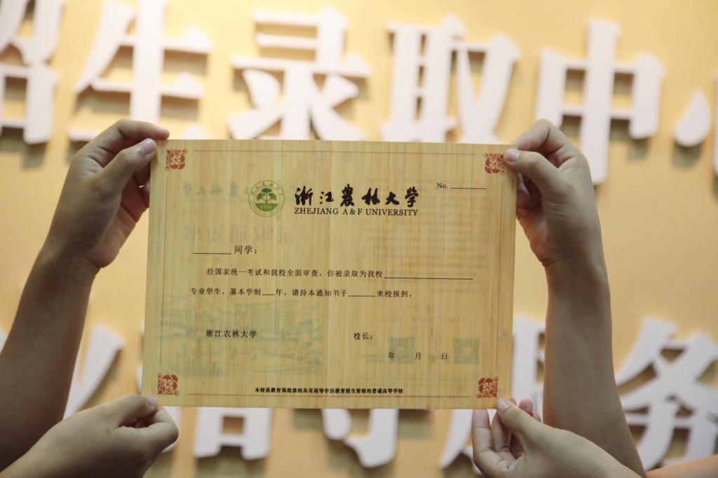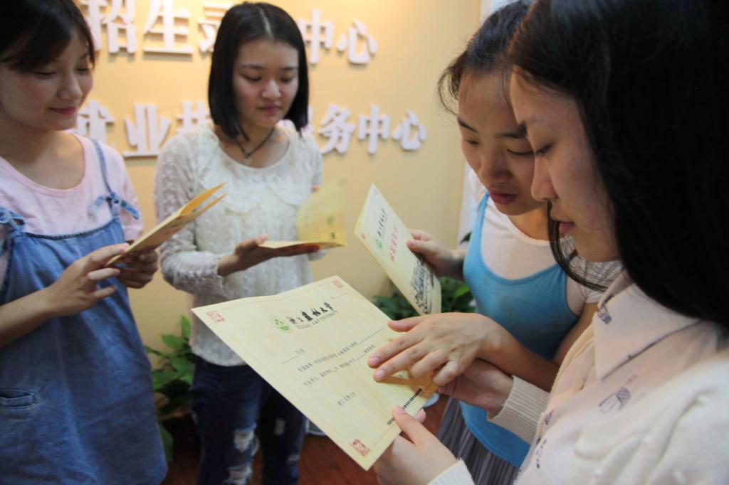 2017年6月25日,浙江农林大学的学生志愿者在查看、展示已经制作完成的2017级本科新生录取通知书。该录取通知书以毛竹为原材料,运用浙江农林大学自主研发的刨切微薄竹技术制作并印刷而成,相关技术曾获国家技术发明奖二等奖,被称为“史上最有科技含量的录取通知书”。