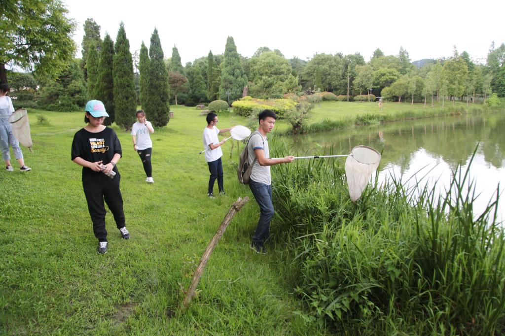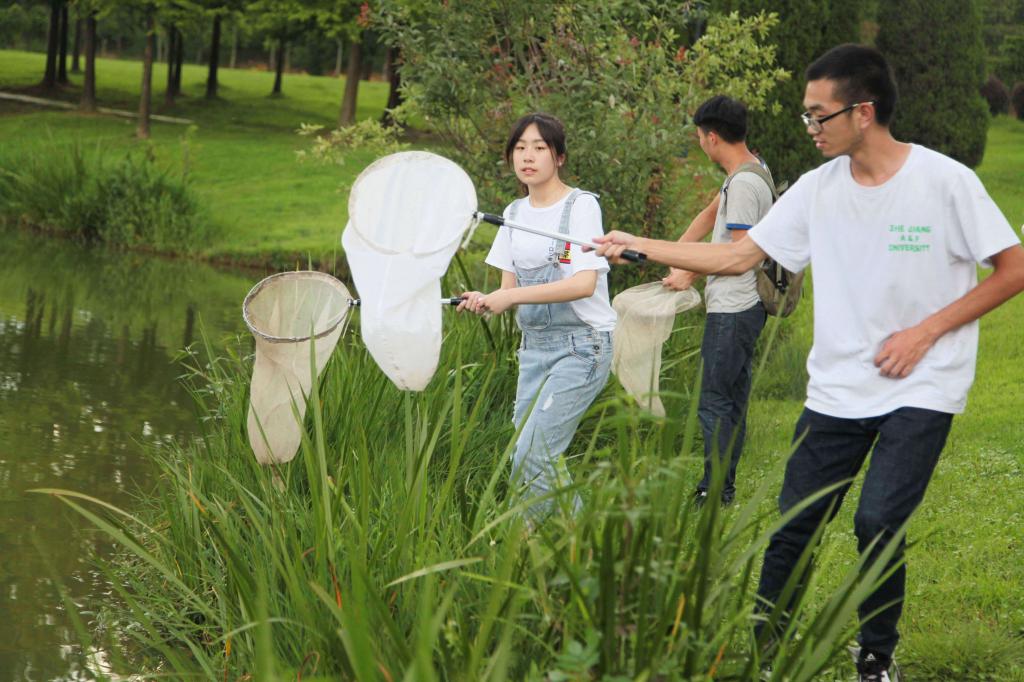 7月5日,浙江农林大学植物保护专业的大二学生,正拿着网兜、广口瓶在学校附近捕捉昆虫。