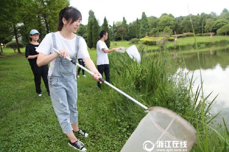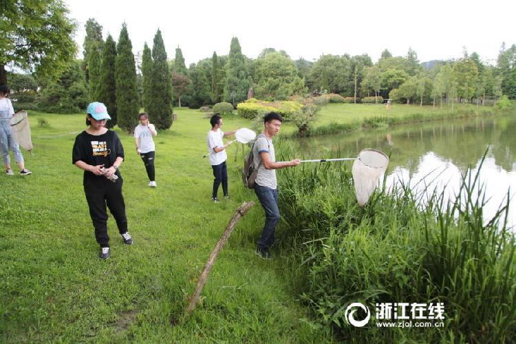 7月5日,浙江农林大学植物保护专业的大二学生,正拿着网兜、广口瓶在学校附近捕捉昆虫。