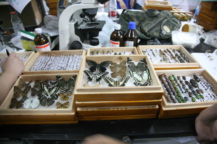 在该校15号学院楼的标本室里,凤蝶、蜻蜓、独角仙、金龟子、竹节虫、蜡蝉、蟑螂、蚊子、红袖蜡蝉……完成昆虫捕捉以后,学生们还根据不同昆虫所属的目、科、属、种,按照标本制作的要求,将昆虫进行分类制作、摆放,整个实验室里的昆虫显得特别有艺术感。