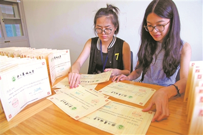 7月18日,浙江农林大学的学生志愿者在查看、展示已经制作完成的2017级本科新生录取通知书。