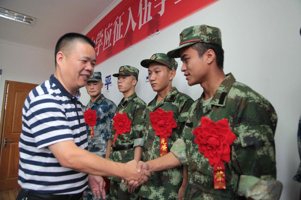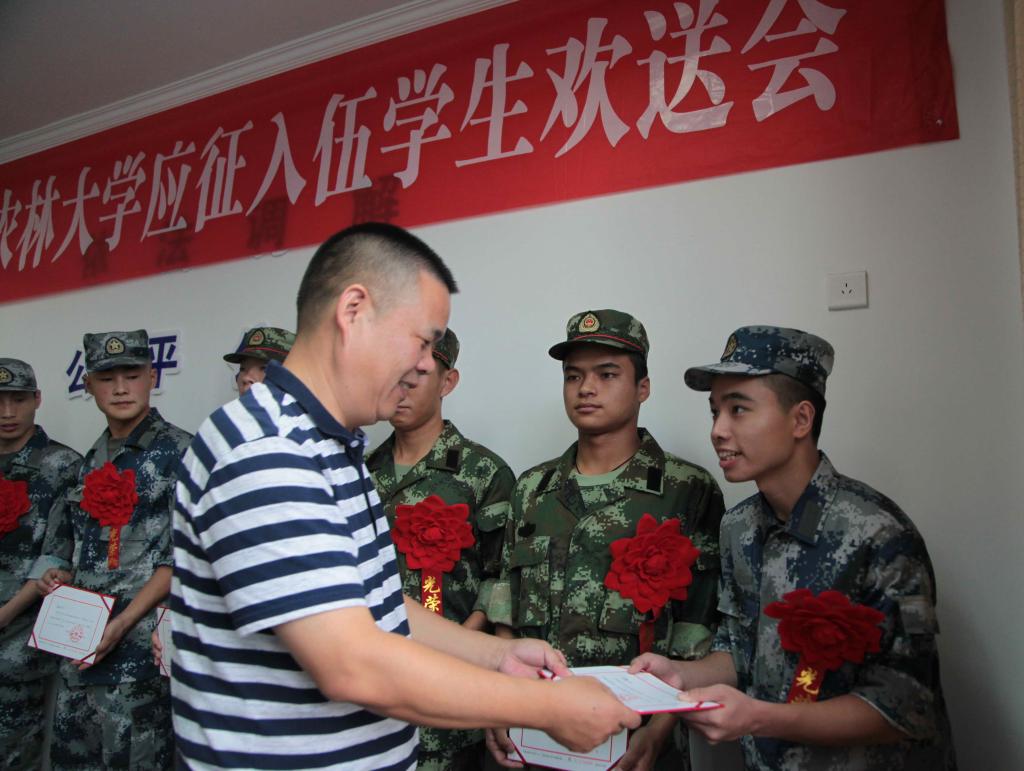 9月9日,浙江农林大学举行2017年大学生入伍欢送会,老师们为入伍学生颁发入伍通知书,入伍学生对军营生活充满期待。