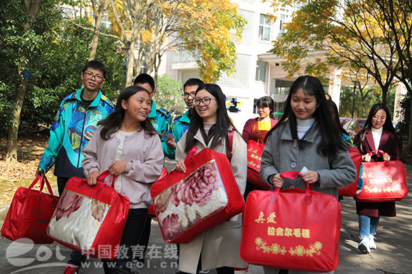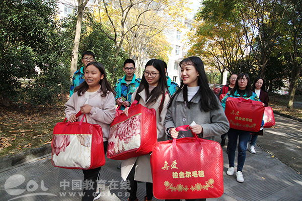 近日,浙江农林大学信息工程学院的经济困难学生领到了棉被、毛毯等御寒物品,大家心里也都感觉暖暖的。