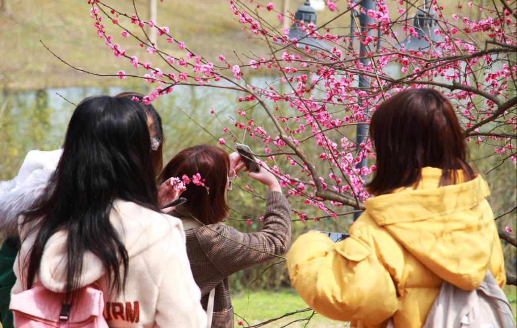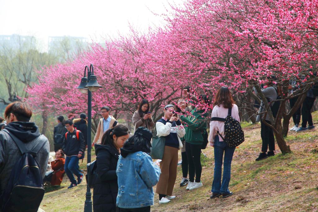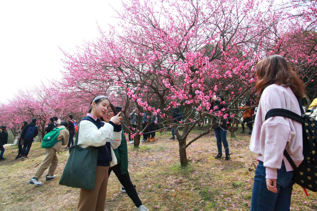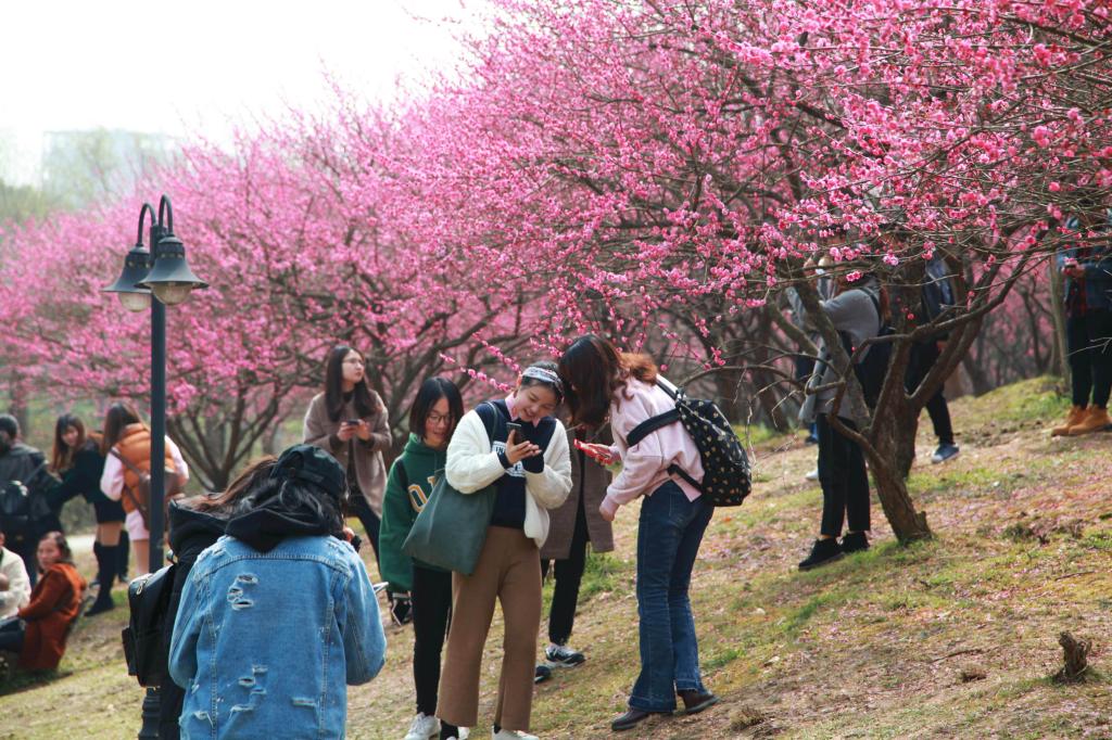 2018年3月9日,浙江农林大学城乡规划专业的学生在校园梅花林里进行《植物学》课程的教学,学生们通过观察梅花、拍摄梅花照片等方式,学习了解梅花的品种、颜色、花瓣特点等方面特性。