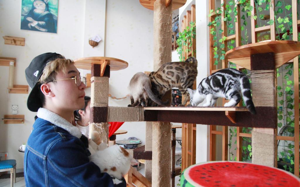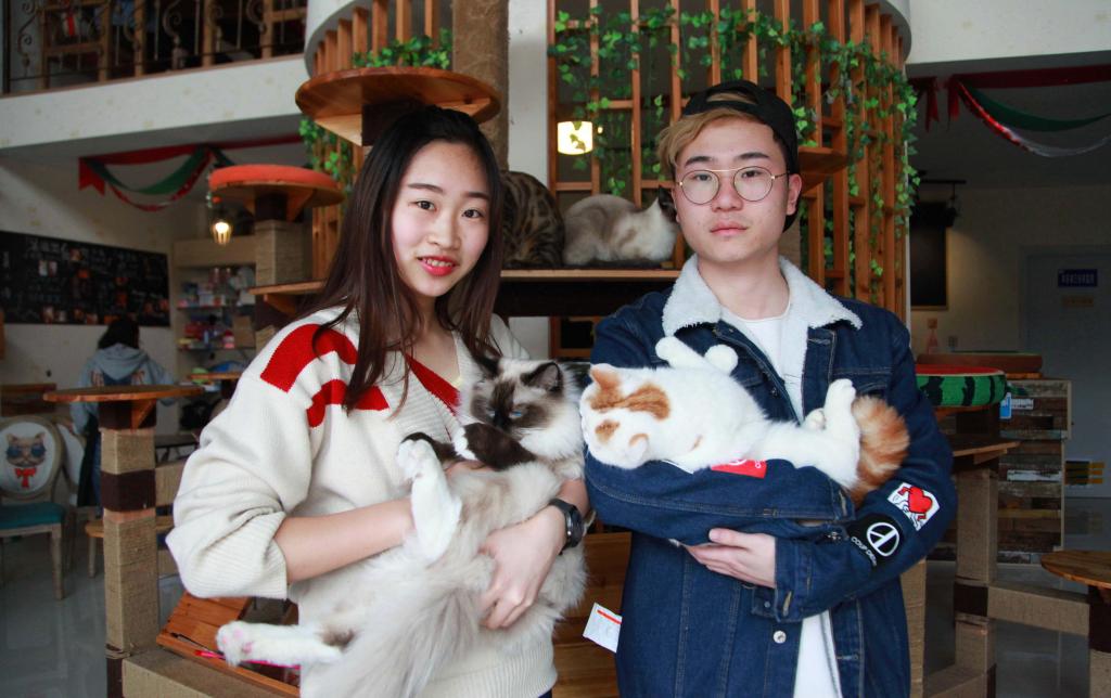 浙江农林大学西侧商业街里有一家咖啡店,主营甜点和饮料,老板是浙江农林大学大二的陈书郁和潘泓静,员工则是10多只可爱的小猫。陈书郁和潘泓静都是浙江宁波人,为了体验不同的生活方式,他们去年在父母支持下盘下了这家店,开始利用课余时间经营。