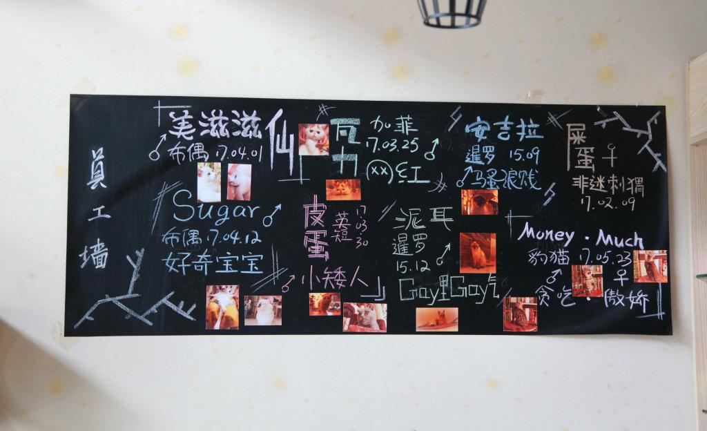 咖啡店里的猫品种丰富:加菲猫、英短、布偶……而且每只猫都有属于自己的名字。这些猫员工,都是陈书郁和潘泓静从各种渠道“挖”来的,他们还专门为宠物猫做了一面员工墙,员工墙上有每只猫的照片、姓名,还标出了它们的生日。