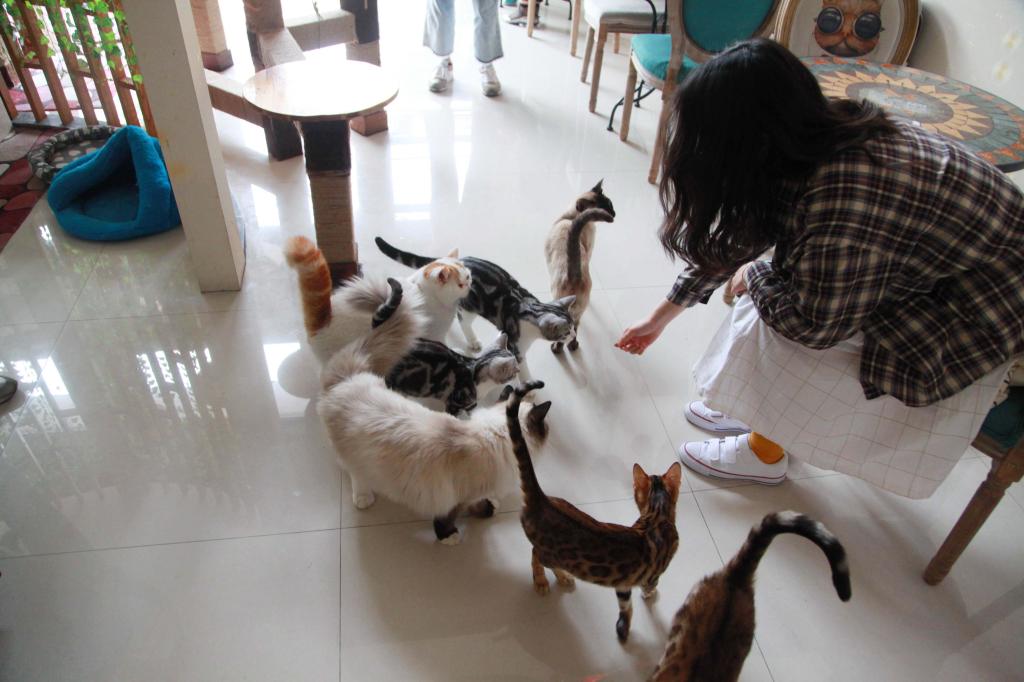 猫员工都经过专门的训练,平时在店里悠闲自在地踱步,巡视店内的情况,时不时招呼一下客人。店里的经营收入主要用于猫员工:猫的食物、猫的玩具、猫的洗漱用品……这家店经营半年多来,大部分收入都投资在了猫的身上。