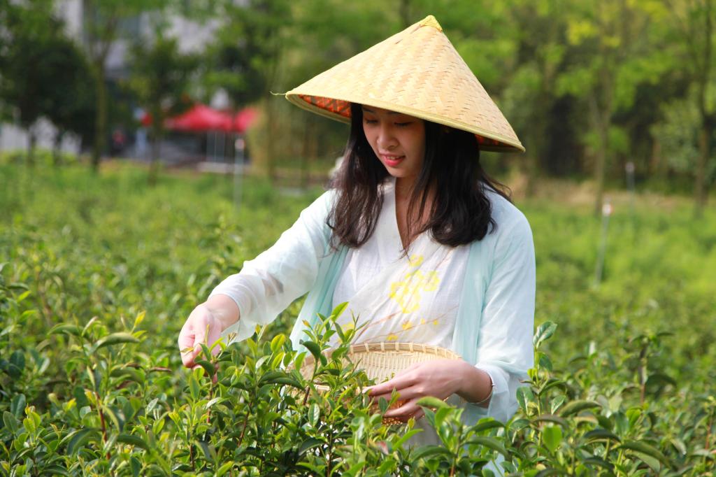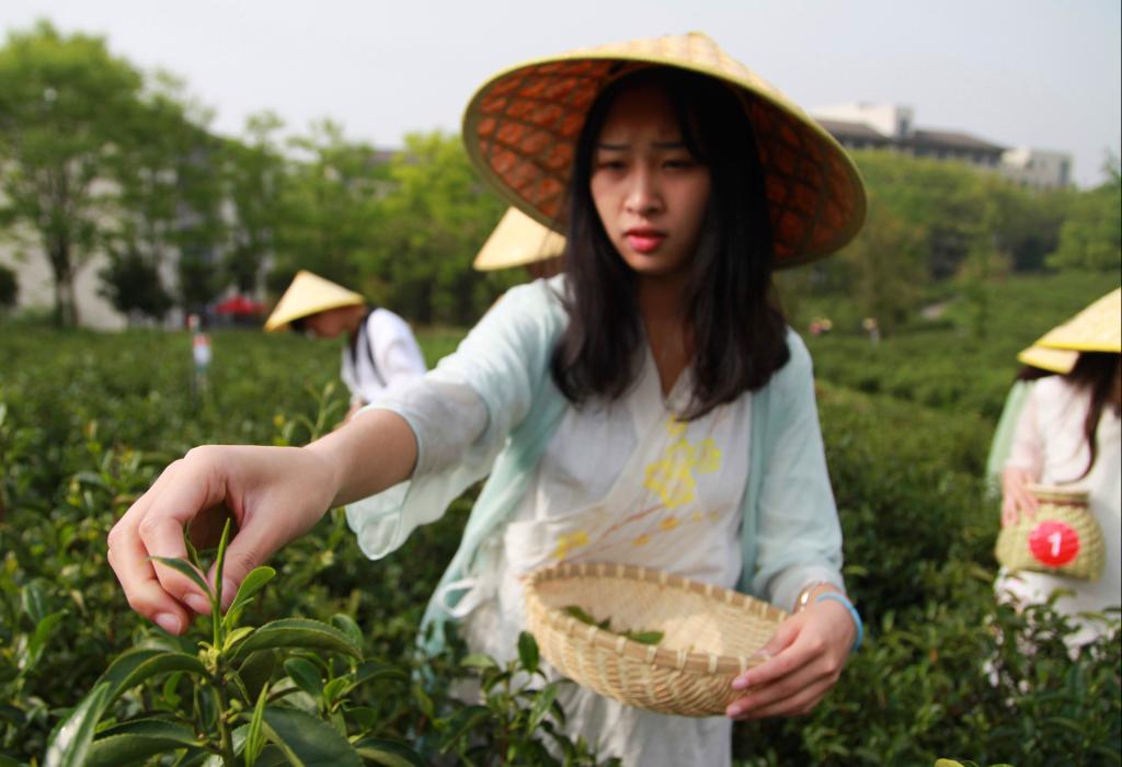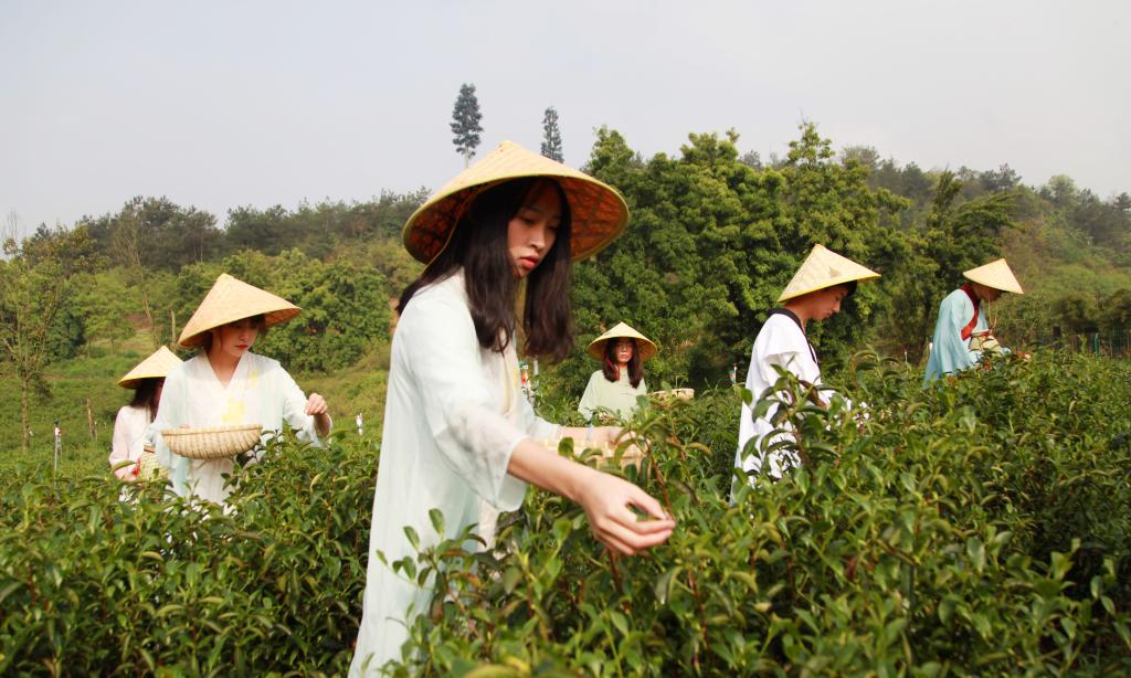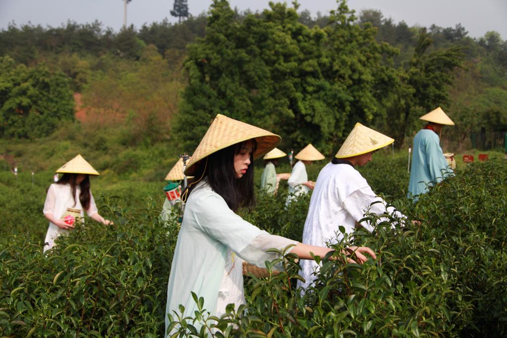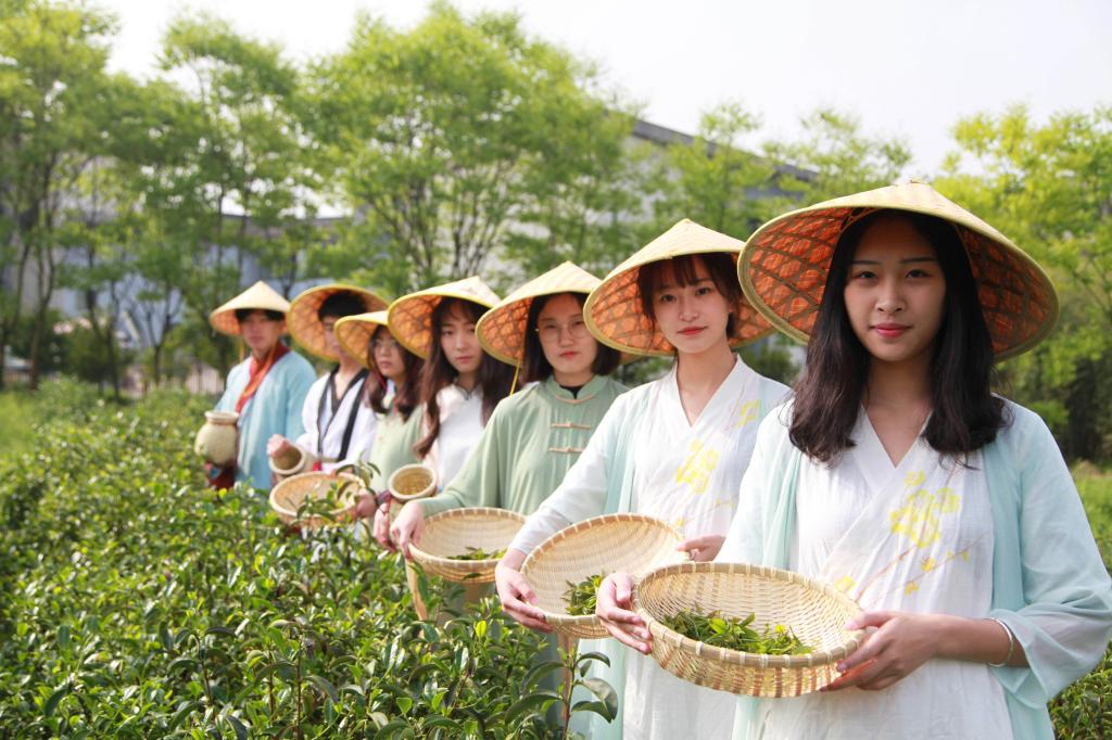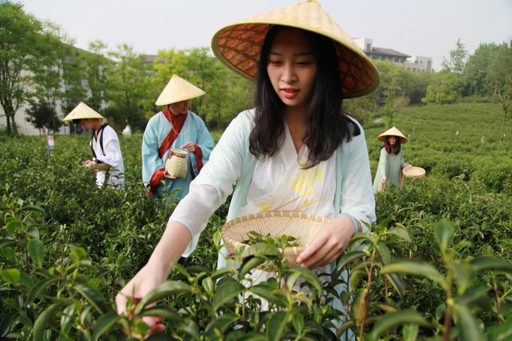 2018年4月15日,浙江农林大学一群爱好茶文化的学生来到该校茶园里,他们身穿服装专业同学设计的茶服学习采茶、体验茶文化。