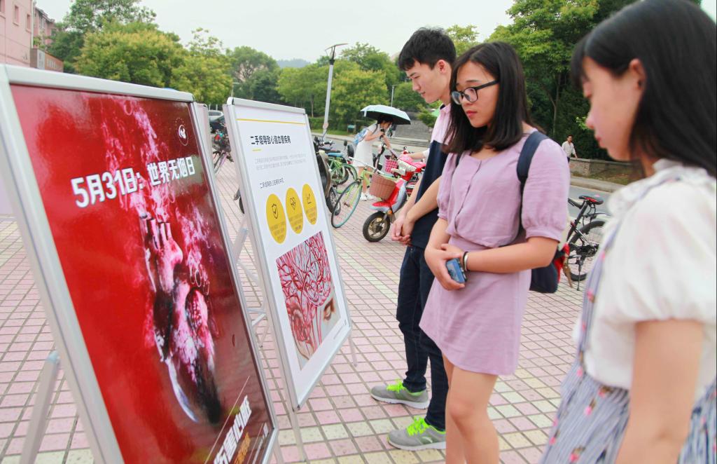 5月31日是世界无烟日,今年的主题是“烟草和心脏病”。浙江农林大学在校园里举行世界无烟日宣传活动,大学生志愿者通过发放宣传资料、举办吸烟危害展览等形式,倡导广大学生拒绝吸烟。图为大学生在参观展板。