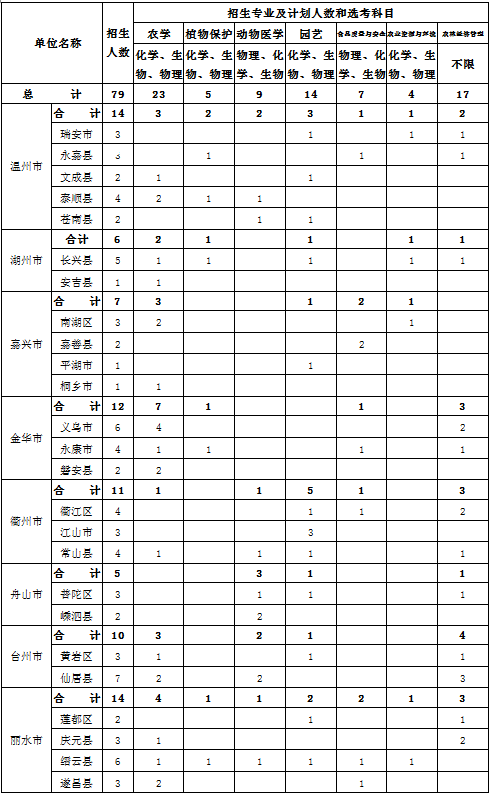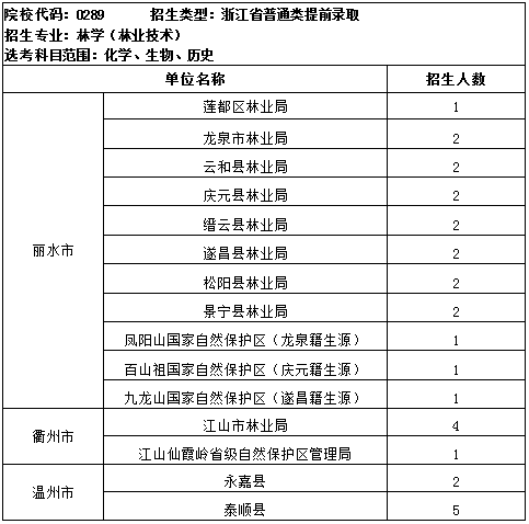 此外,今年浙江农林大学继续与丽水职业技术学院联合承担为丽水市衢州江山市定向培养基层林技人员(本科)工作,为丽水、衢州、温州市定向培养基层林技人员30名,其中浙江农林大学2年,丽水职业技术学院2年,招生专业为林学(林业技术)。安排在高校招生的普通类提前录取。招生代码:0289。