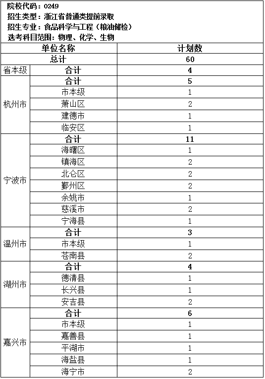 经浙江省粮食局、浙江省教育厅、浙江省财政厅批准,2018年浙江农林大学继续承担定向培养粮油储检人员工作,为全省各级粮食系统用人单位定向培养粮油储检人员60名,招生专业为食品科学与工程(粮油储检)。并安排在高校招生的普通类提前录取。粮油储检人员学生毕业后,须按定向培养协议到相应的各级粮食系统用人单位工作,正式入职后,在校期间学费由用人单位一次性奖补。招生代码:0249。