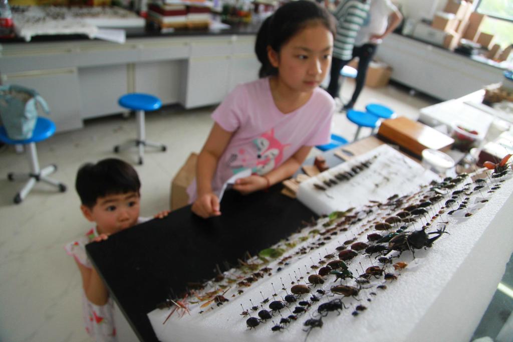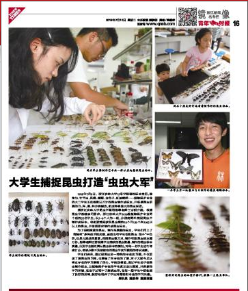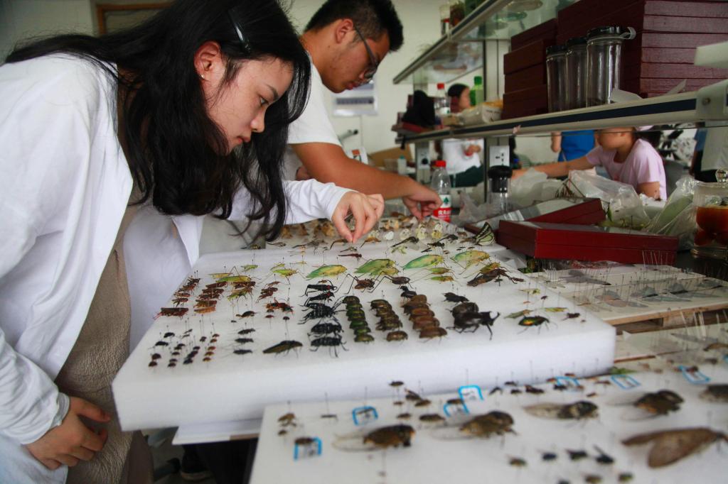 2018年7月8日,浙江农林大学15号学院楼的标本室里,独角仙、竹节虫、凤蝶、蜻蜓、金龟子、红袖蜡蝉……植物保护专业的大二学生们正在将数以万计的昆虫制作成标本,并根据昆虫所属的目、科、属、种分类摆放,组成阵容庞大的昆虫军团。