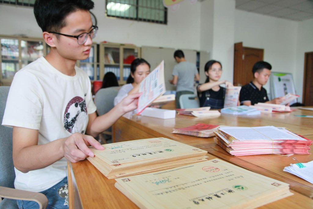 2018年7月20日,浙江农林大学的学生志愿者在整理、校对2018年本科新生录取通知书,并装入信封于开始陆续邮寄。