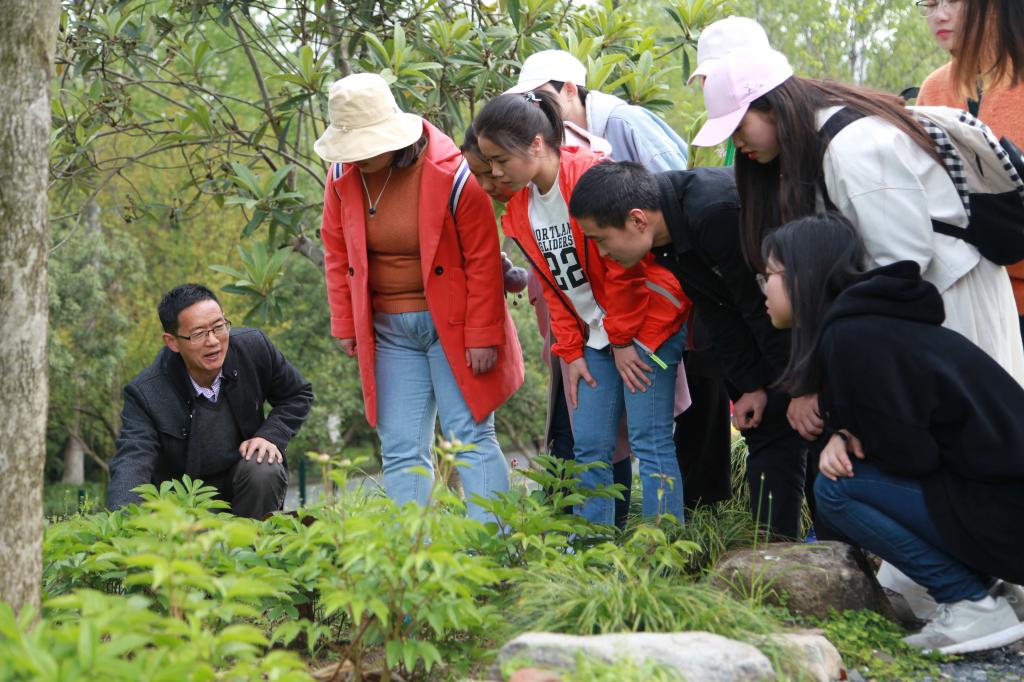 右图:4月12日,浙江农林大学东湖校区的“百草园”里,中药学专业教师徐建伟(左)在指导学生辨认各种中草药、了解中草药的药性和生长习性。