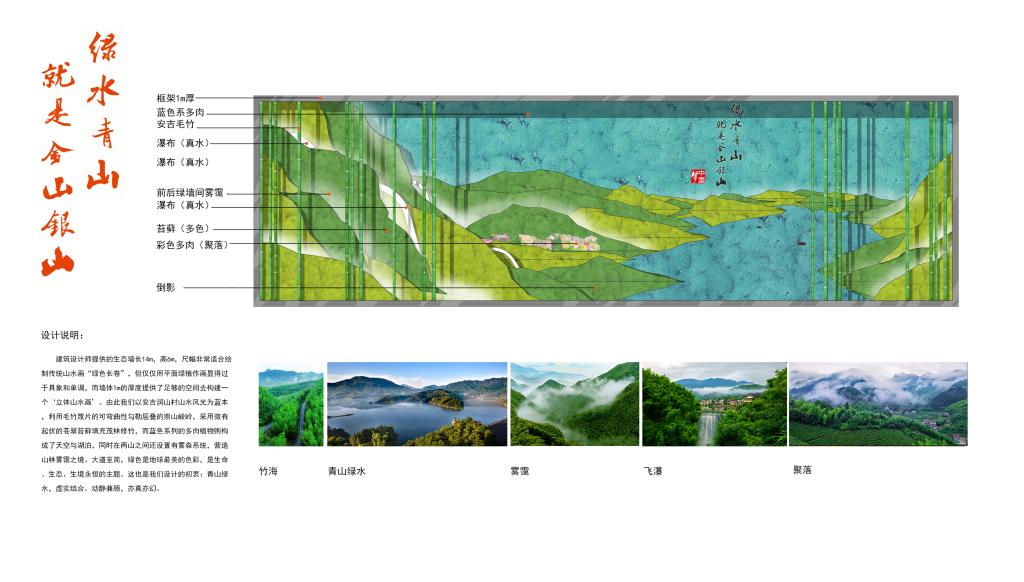 赵宏波表示,作为习近平同志亲自擘画的生态省,10多年来,浙江踏踏实实地沿着“绿水青山就是金山银山”的路子,坚定不移地走下去,持续整治环境污染、不断提升生态优势、接续培育生态文化,让绿色成为浙江发展最耀眼、最动人的色彩,一条青山绿水的绿色之路已经铺展,这为“生态墙”的设计提供了最好的灵感和方向。
