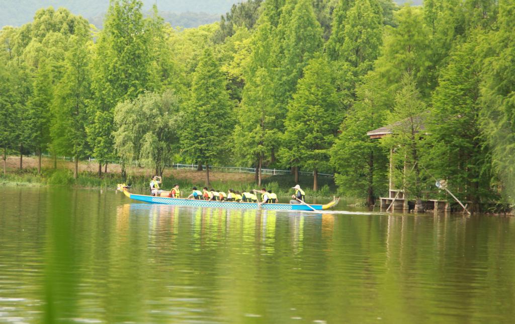昨天,浙江农林大学的大学生龙舟爱好者,在校园内的东湖里练习划龙舟。