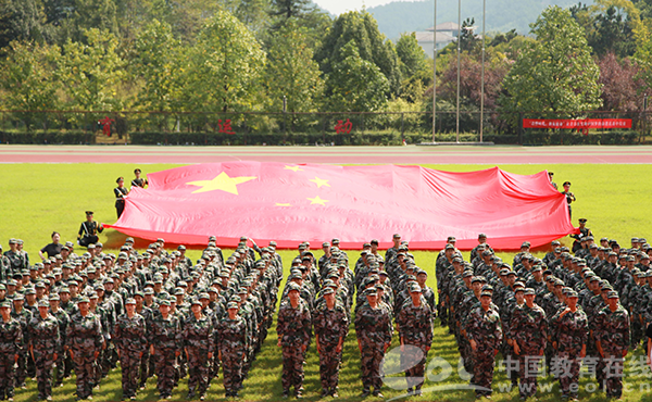 2019年9月17日,浙江农林大学正在参加军训的大一新生,在学校运动场上开展“青春告白祖国”活动。参加活动的学生举起巨幅五星红旗,齐唱“红旗飘飘”等红色歌曲,用青春告白祖国,祝福伟大祖国繁荣昌盛。
