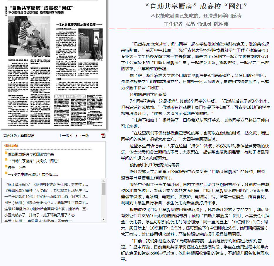 浙江农林大学后勤集团公寓服务中心,是负责“自助共享厨房”的预约、规范、监督等日常管理工作的部门。