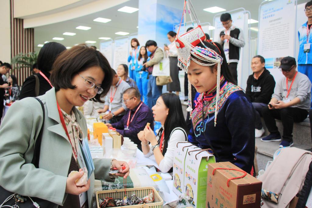 近日,“农信杯”第二届浙江省大学生乡村振兴创意大赛总决赛在浙江农林大学举行。来自全省73所高校的212个项目进入总决赛,1000多名高校师生参加了角逐,参赛作品为空心村改造、乡村景区打造、农业品牌塑造等提供了解决思路和方案。图为农产品销售推广现场。