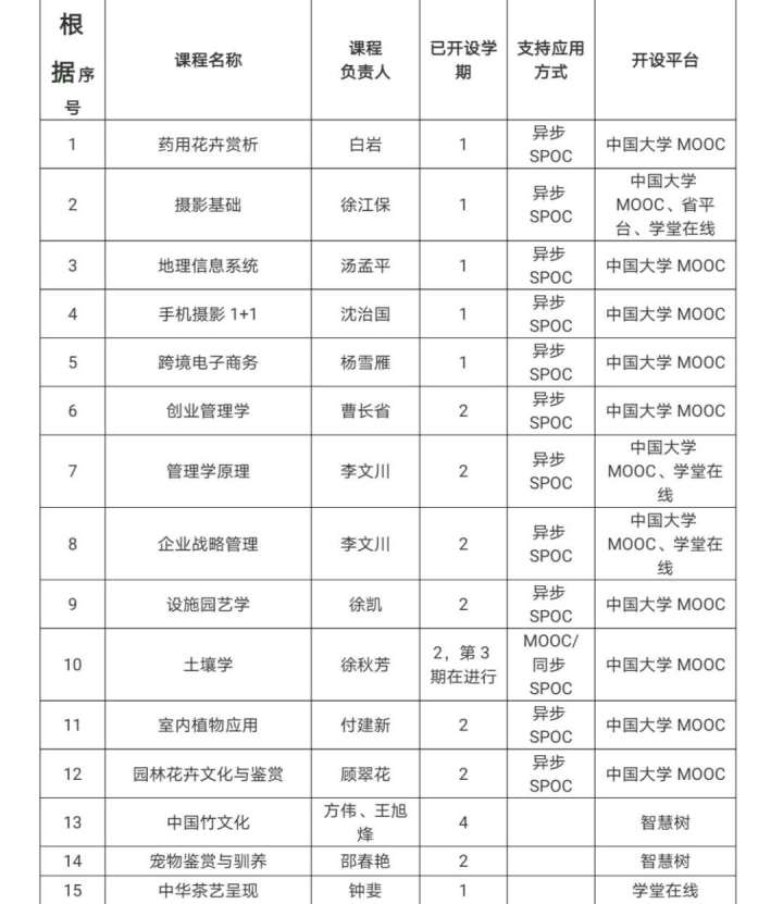 15门课程中,《药用花卉赏析》《摄影基础》《地理信息系统》《手机摄影1+1》《跨境电子商务》《创业管理学》《管理学原理》《企业战略管理》《设施园艺学》《土壤学》《室内植物应用》《园林花卉文化与鉴赏》等可以在中国大学MOOC平台免费学习,《摄影基础》《管理学原理》《企业战略管理》《中华茶艺呈现》可以在学堂在线平台进行学习,《中国竹文化》《宠物鉴赏与驯养》等可以在智慧树平台学习。