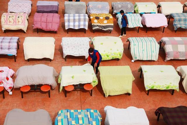 4月22日,浙江农林大学后勤集团的宿管阿姨们,正按照预约报名情况,为即将开学返校的学生们翻晒被子。