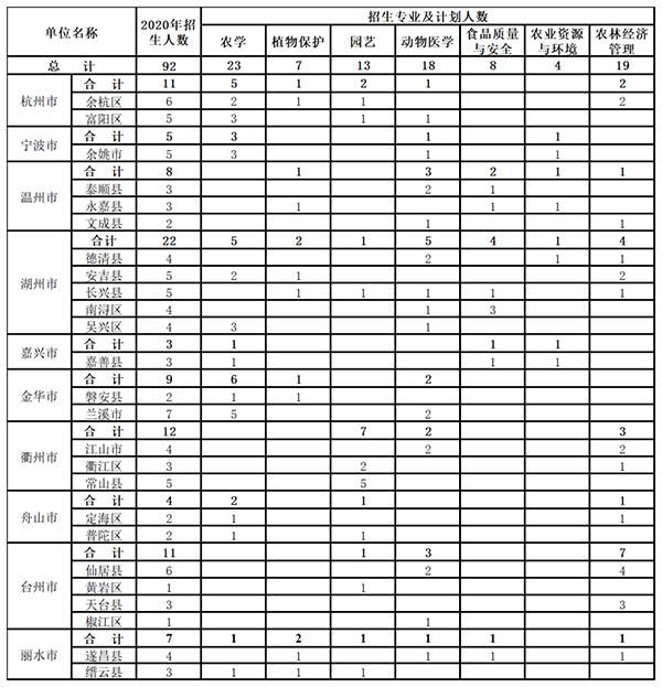 2020年全省定向培养基层农技人员92名,定向培养工作由浙江农林大学承担,主要培养纯农类专业学生。定向培养实行招生与乡镇农技推广机构公开招聘工作人员并轨进行,按照“先填志愿,后签协议”的原则,按考生户籍以县(市、区)为单位实施定向招生(招聘)。