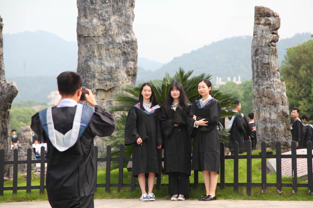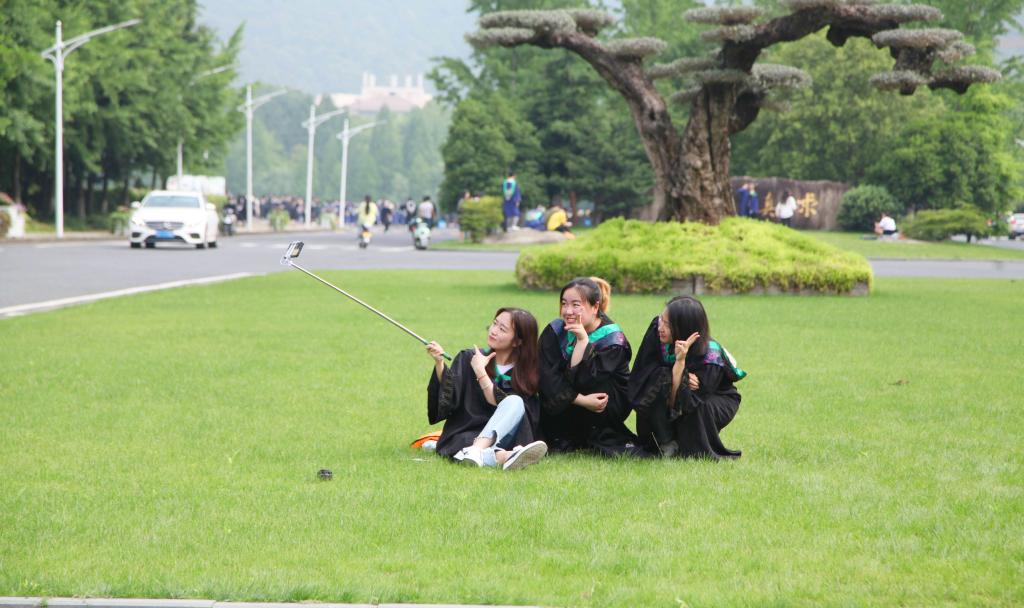 6月1日,浙江农林大学农学院的应届毕业生在校园里拍摄毕业照。毕业生们用这种方式,留恋在校园里度过的美好青春,纪念自己即将结束的大学生活。