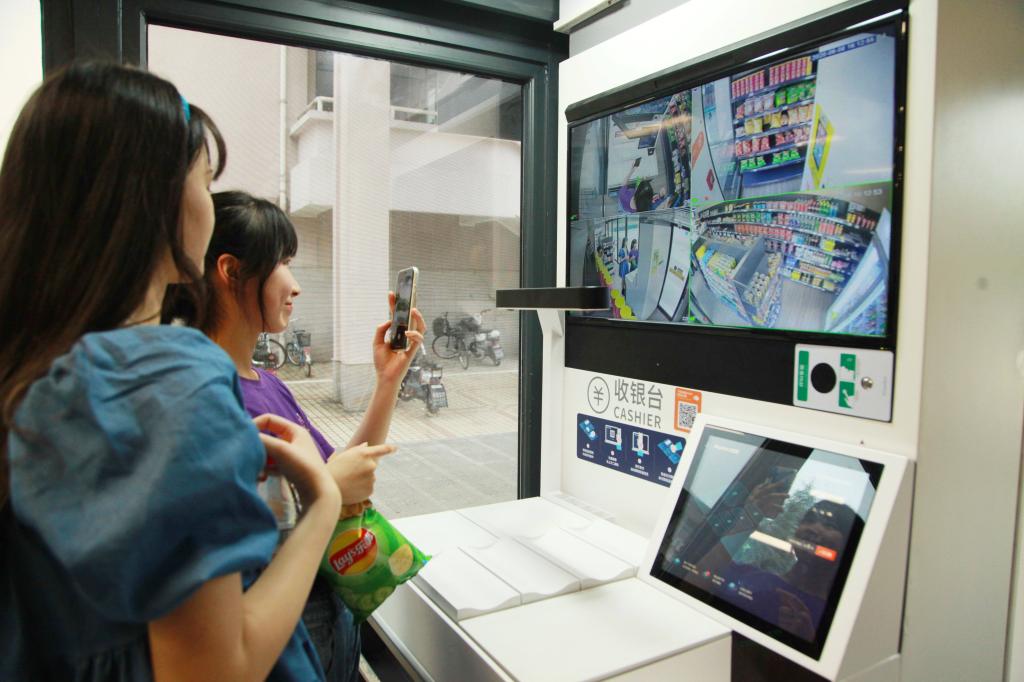6月9日,浙江农林大学求真生活无人超市又迎来了一批购物的师生。该超市24小时营业,经营休闲零食、方便速食等多种商品类别。超市还能通过大数据精准定位目标用户,向广大师生推荐意向选购商品。图为学生在超市自助机前结账。
