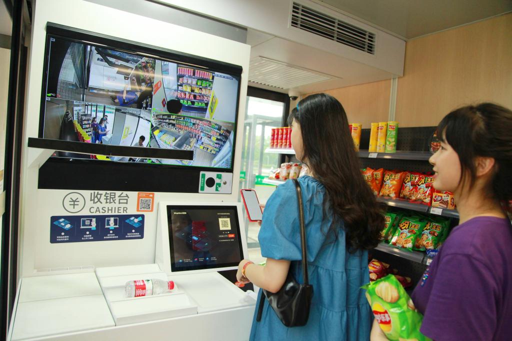2020年6月9日,浙江农林大学师生在校园里的求真生活无人超市——缤果盒子里自助购买零食、饮料。