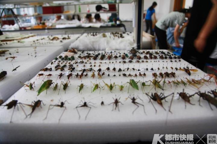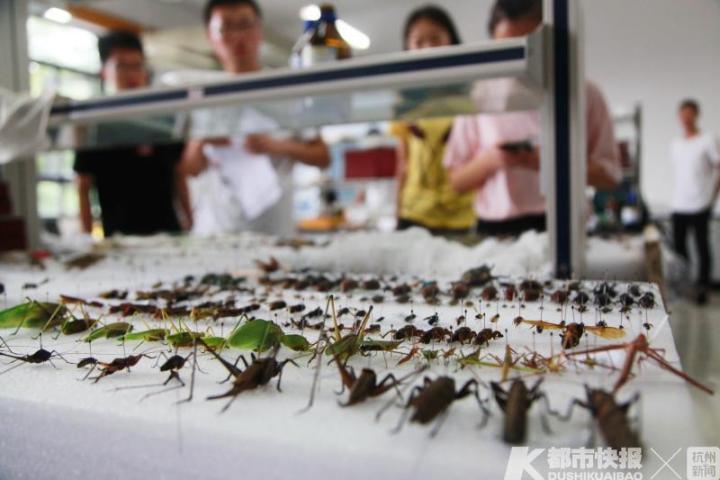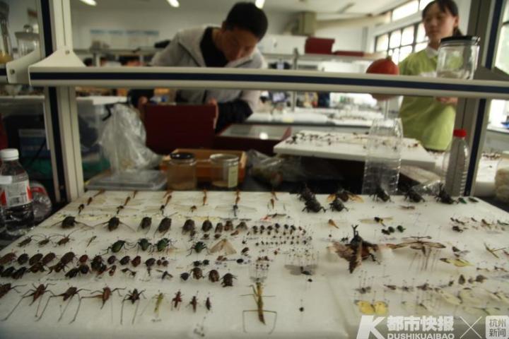 “独角仙、锹甲、绿尾大蚕蛾都是我们组的招牌昆虫。”“捉昆虫可有意思了,以前看到这些虫子会觉得很害怕,现在都会觉得很兴奋,还想着去发现它可爱和美丽的一面。”“以前看到蚊子苍蝇都讨厌,现在在寝室里发现它们,可能会很兴奋,因为在我们眼里,它们都是可爱的标本。”在浙江农林大学15号学院楼3楼的实验室里,该校植物保护专业的学生们,在开心地制作昆虫标本。