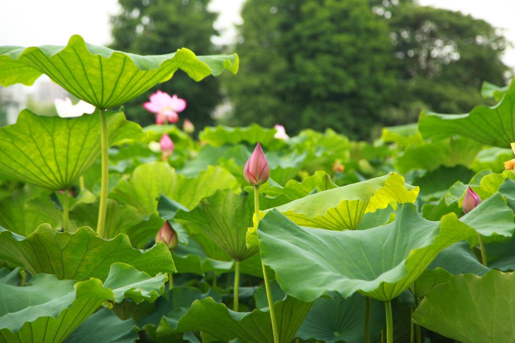 荷叶像一个个大圆盘,又像一把把小绿伞。
