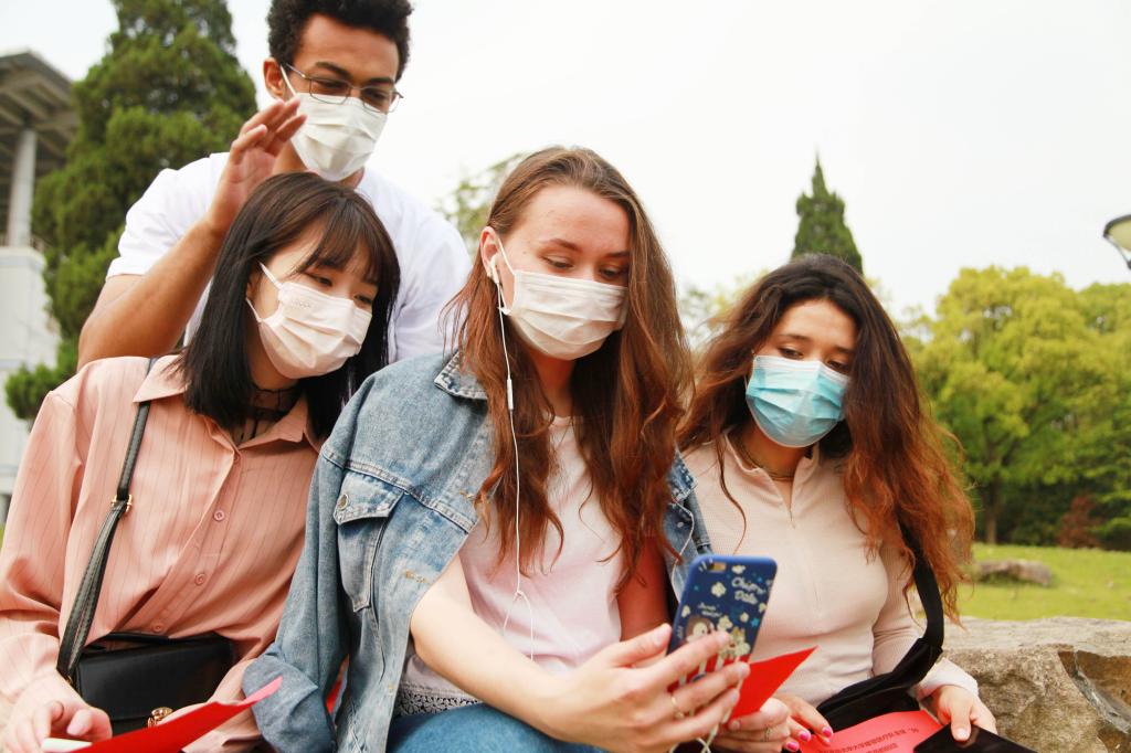 浙江农林大学国际学院的俄罗斯籍留学生孔娅(KRISTINA SOBOLEVA),正和同学们一起通过视频给在俄罗斯的家人报平安。新冠疫情发生后,为了确保校园安全,浙江农林大学实行校园全封闭管理,不少国际生表示:学校对我们很关心,疫情防控工作做得很好,在中国,比回国更安全。