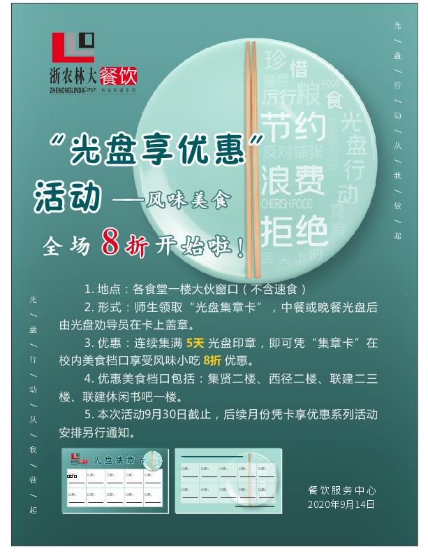 从8月中旬开始,浙江农林大学就在全校各个食堂积极倡导“厉行节约、反对浪费”的风气,面向全校师生开展了“人人争做光盘族”活动。学校食堂专门安排“光盘劝导员”,引导师生争做就餐光盘族,先后开展就餐光盘赠送水果、就餐光盘买小吃打八折等活动,积极营造“节约光荣 浪费可耻”的浓厚氛围,受到了大家的欢迎。
