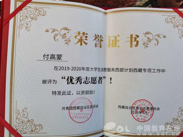 2020年,付高蒙先后被评为2019-2020年度大学生志愿服务西部计划西藏专项工作“优秀志愿者”,那曲市2019-2020年度大学生志愿服务西部计划“优秀志愿者”。一年志愿服务期满后,她并没有停下志愿服务的步伐,而是选择了继续留在那曲。