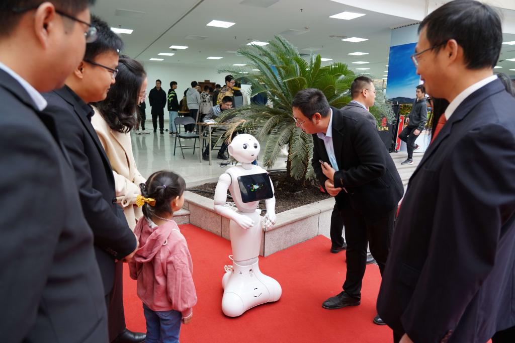 日前,在浙江农林大学第二十届学生IT文化节上,由该校计算机专业师生编程设计的人工智能机器人“小玉”吸引了很多师生的关注。这个人工智能机器人不仅能主持活动,还能对话、唱歌、跳舞。图为浙江农林大学师生在和人工智能机器人“小玉”对话交流。
