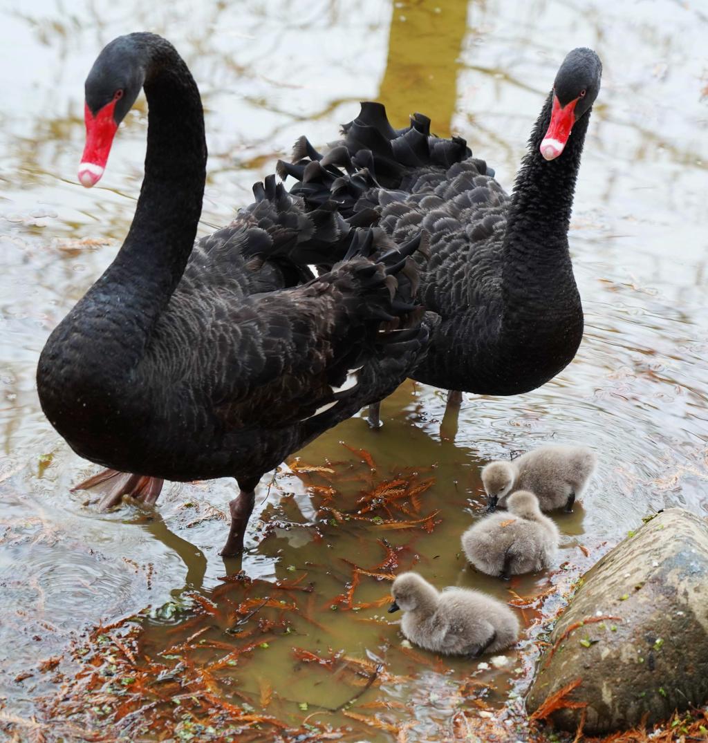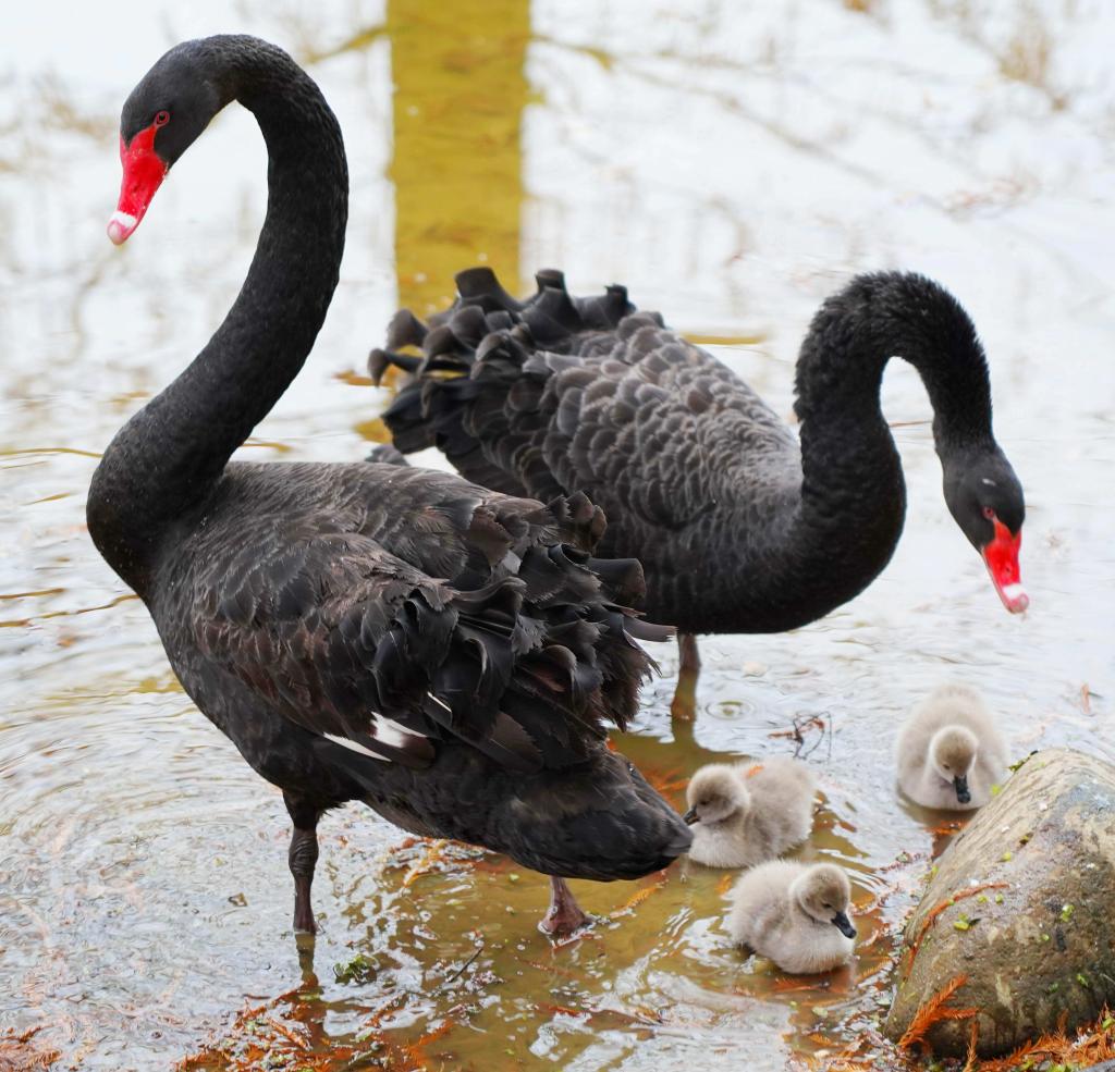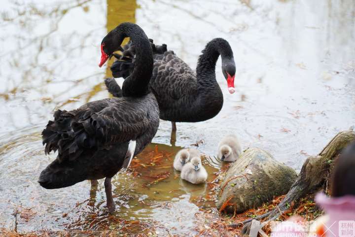 2021年1月6日,浙江农林大学的东湖里,黑天鹅夫妇正带着它们的“三胞胎”——小天鹅宝宝在觅食、嬉戏。