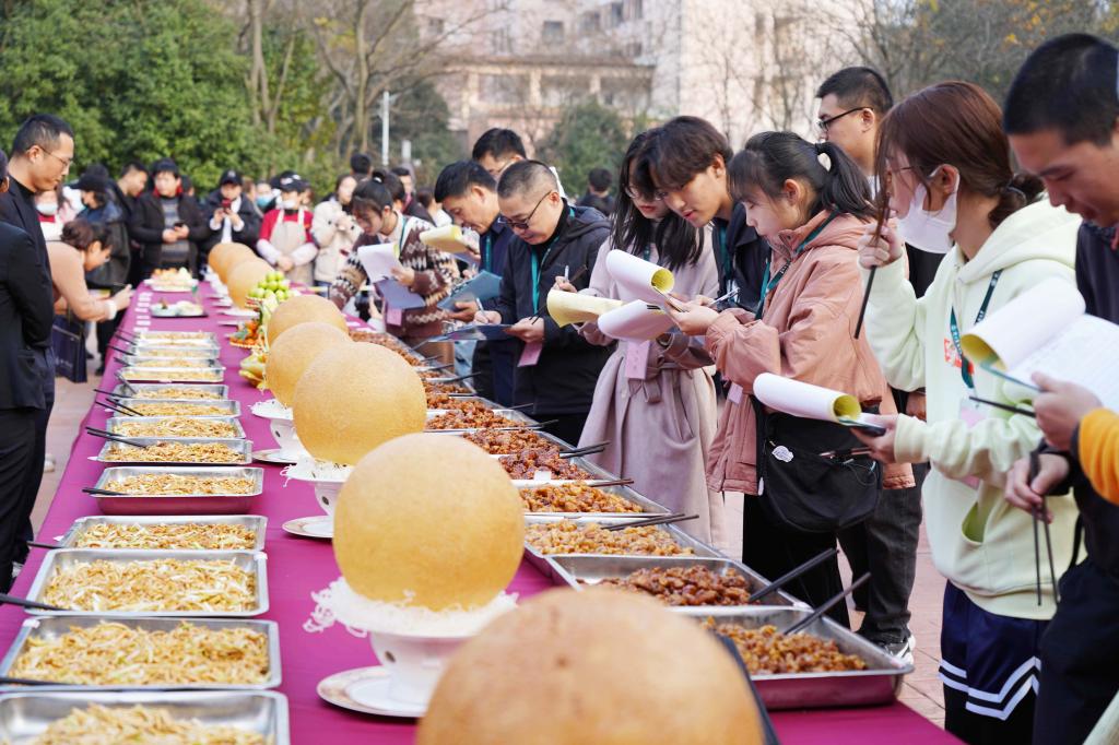 近日,浙江农林大学举行后勤文化节餐饮岗位技能大赛。该校各食堂的近百名厨师和员工,在校园里现场烧制了近千道美食供全校师生免费试吃、品尝。各食堂将根据师生品尝和评选的结果,陆续推出受师生欢迎的好菜品。图为评选现场。