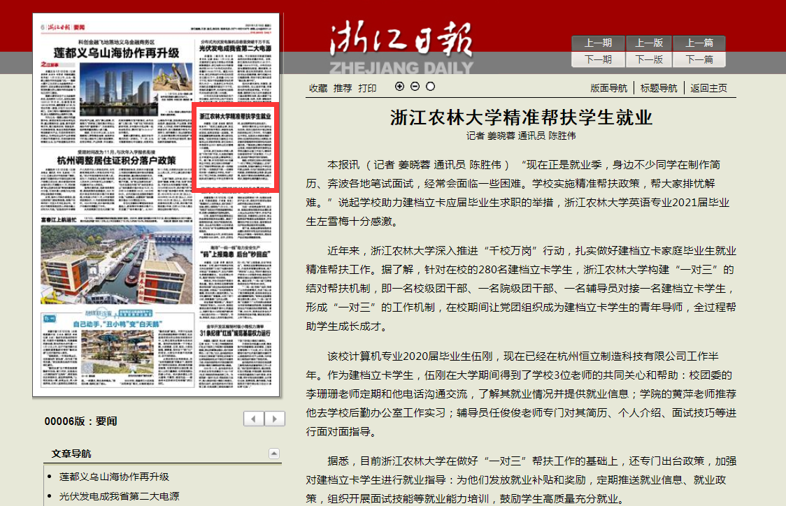 据悉,目前浙江农林大学在做好“一对三”帮扶工作的基础上,还专门出台政策,加强对建档立卡学生进行就业指导:为他们发放就业补贴和奖励,定期推送就业信息、就业政策,组织开展面试技能等就业能力培训,鼓励学生高质量充分就业。