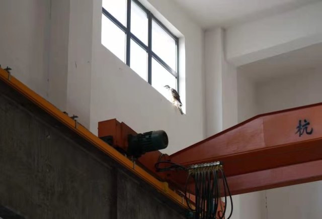 两天前,一只大鸟误打误撞,飞入浙江农林大学力学实验室。和别的教学楼不一样,这个实验室因为进行力学实验需要,是按照特殊要求建设的,虽然只有一层,但是高度近15米,在靠近南北屋顶的位置,两侧分别有一排用于采光的全封闭玻璃窗户。这只大鸟从大门飞进实验室后,直接往上飞,冲着屋顶的玻璃窗户一个劲的冲撞,却始终难以脱困。