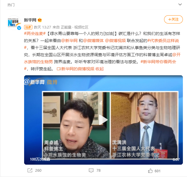 碳汇是什么?和我们的生活有怎样的关系?一起来看由@新华网和@微博媒体@微博视频联合发起的#代表委员这样说#,看十三届全国人大代表 浙江农林大学党委书记沈满洪和从事鱼类分类与生物地理研究,长期在全国山区开展淡水生物资源调查与环境评估方面工作的科普博主周卓诚@开水族馆的生物男跨界连麦。听听专家对环境治理的看法与感受。#新华网带你看两会#
