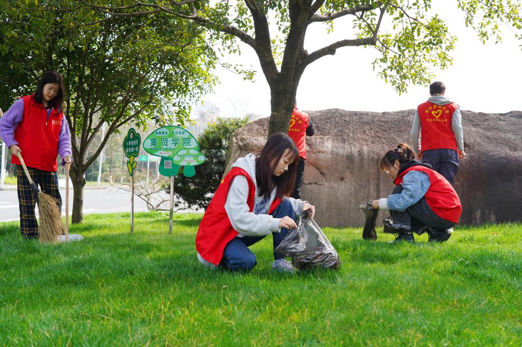 2021年3月14日,浙江农林大学集贤学院的学生志愿者们在校园里除杂草、捡垃圾,精心管理属于自己学院负责的一片绿地。 为充分发挥生态校园的育人功能,该校将近3000亩的校园全部"承包"给各个学院、班级的所有学生,管护校园绿地成为全校学生没有学分的"必修课"。