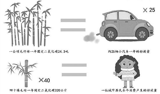 与同处于亚热带地区的其他森林相比,毛竹林的固碳能力排在首位,是针阔混交林的1.32倍,是马尾松林的3.90倍。换算下来,平均一株毛竹年可固定吸收8公斤二氧化碳,平均40棵毛竹就能够抵消掉一个人一年排放的二氧化碳,一公顷毛竹约可以抵消25辆小汽车一年的排放量。