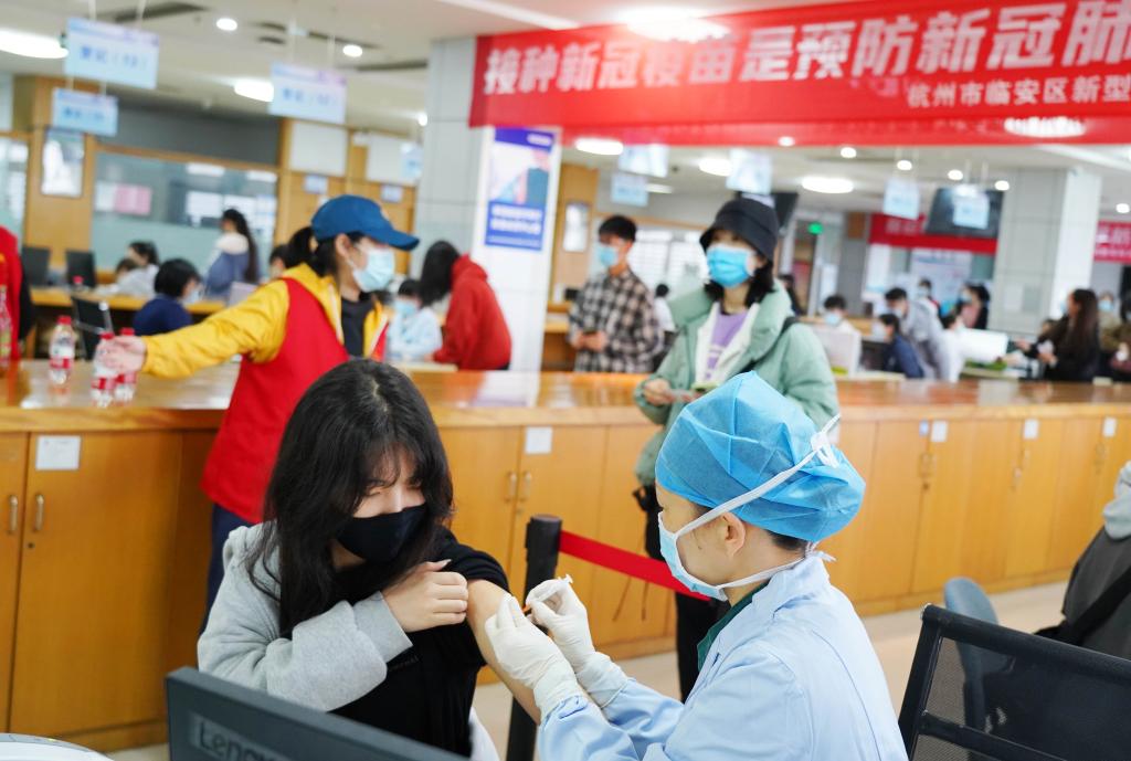 4月11日,杭州市临安区新冠疫苗方舱临时接种点里,浙江农林大学师生正在有条不紊地接种新冠疫苗,共建校园免疫屏障。
