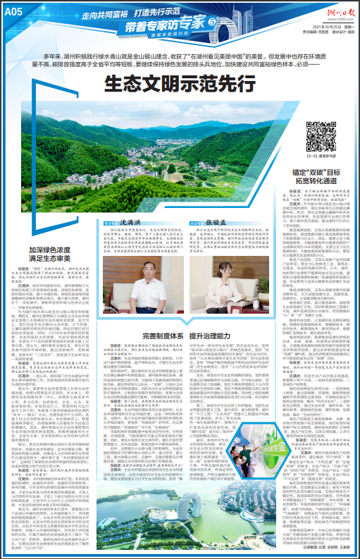面向新时代,建议湖州在生态文明制度建设上要关注碳达峰碳中和制度建设。湖州服务绿色发展、循环发展的制度比较完善,但服务于低碳发展的制度比较欠缺,建议用好地方立法这一“武器”,以地方立法推动生态文明制度建设,同时关注生态文明制度建设的可复制性,让制度在保障自身的同时,更要为全国生态文明制度建设提供可复制、可移植的样本和经验。
