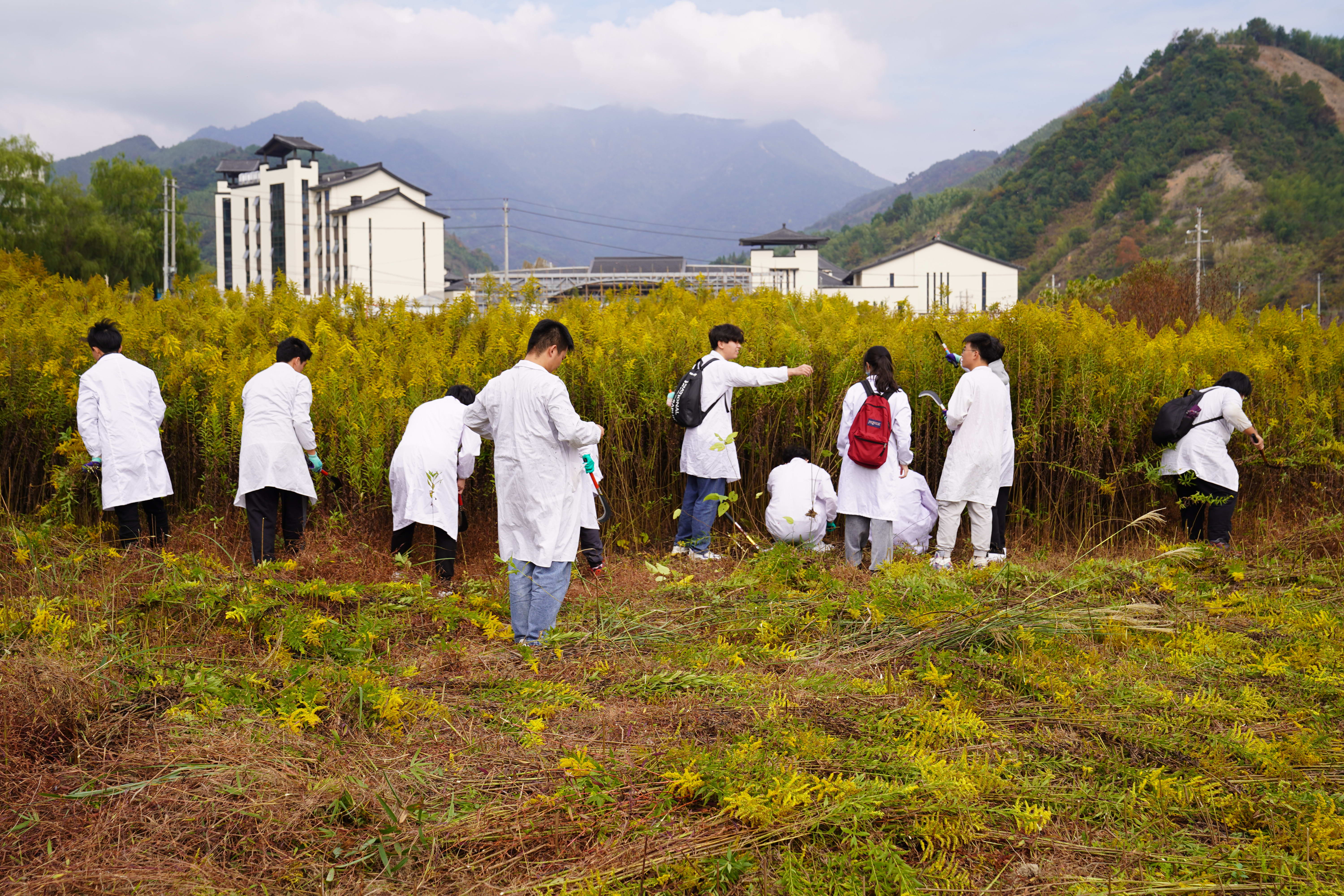 了解到杭州市临安区部分地方出现加拿大一枝黄花的踪迹后,浙江农林大学植物保护学科的师生行动起来。在临安区农业农村局植物检疫站副站长汪天娜、浙江农林大学植物保护学科教师王吉锐的指导下,数十名师生展开了一场除草实践课。他们穿上“白色战衣”,戴上手套,手拿专用镰刀,兵分几路“联合包抄”,看到加拿大一枝黄花,就从底部将其割除,铲除“生态杀手”,切断种子传播途径。