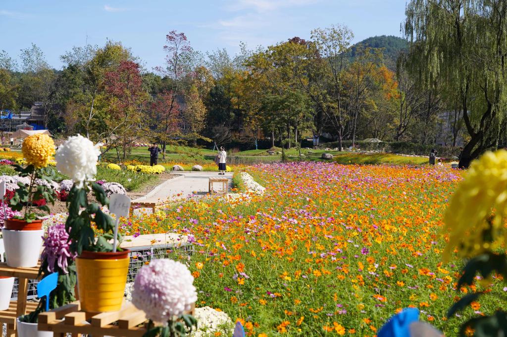 11月14日,浙江农林大学校园内繁花似锦,菊花、秋英等花卉争相开放,把整个校园点缀得格外美丽,吸引了众多师生来此赏花。