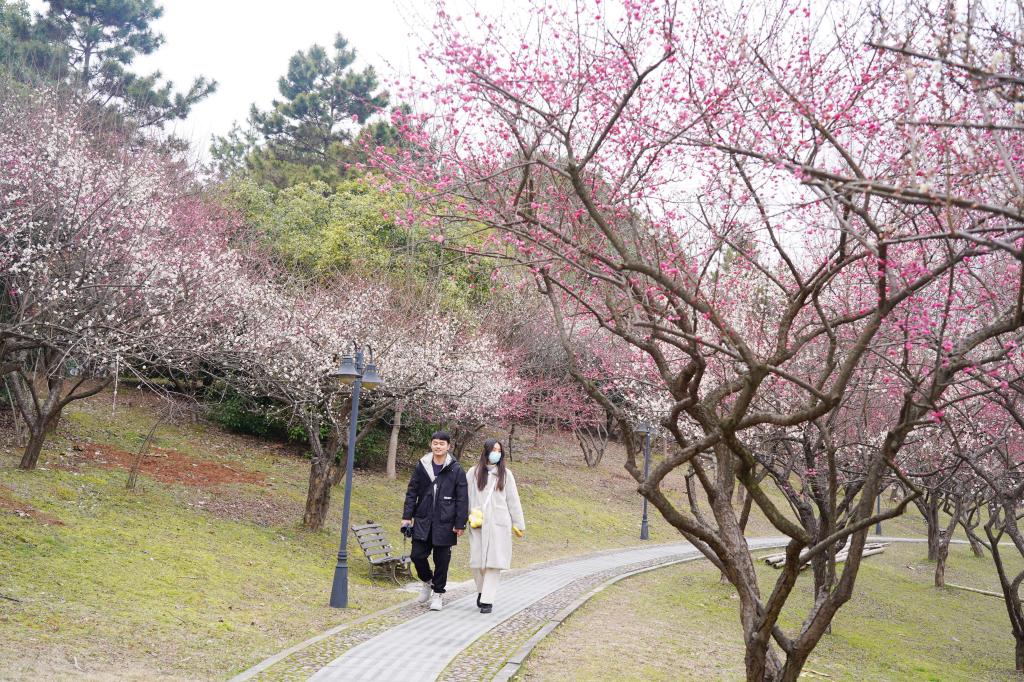 春回大地,浙江农林大学校园里,百米梅花长廊的数千株梅花次第盛开,格外美丽。