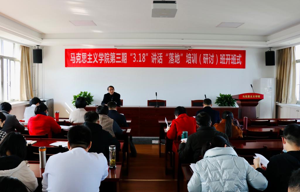 为全面提高思政课教育教学质量,加强思政课教师综合素质和能力的提升,3月3日,马克思主义学院举办第三期“3.18”讲话“落地”培训(研讨)班开班式。学校教学质量监控与评估中心、教师教学发展中心副主任(主持工作)尹国俊、学校督导组组长胡云江、省内高校思政课教师代表聂小莉应邀出席,学院领导、全国优秀教师和全国优秀思政课教师、省高校思政课教学指导委员会委员、省高校思政课名师工作室负责人及全体教师参加会议。开班式由院长高君主持。