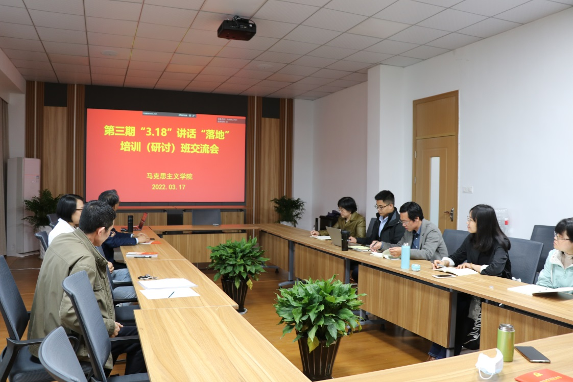 2022年3月18日是习近平总书记在学校思想政治理论课教师座谈会上发表重要讲话三周年。3月17日下午,马克思主义学院召开了重温“3.18”重要讲话精神暨“落地”培训(研讨)交流会。交流会由院长高君主持,雷家军教授和宫瑜副教授主讲,学院党总支书记仲晓婷及部分师生代表参加交流会。