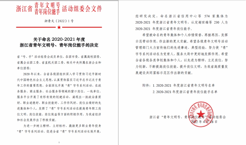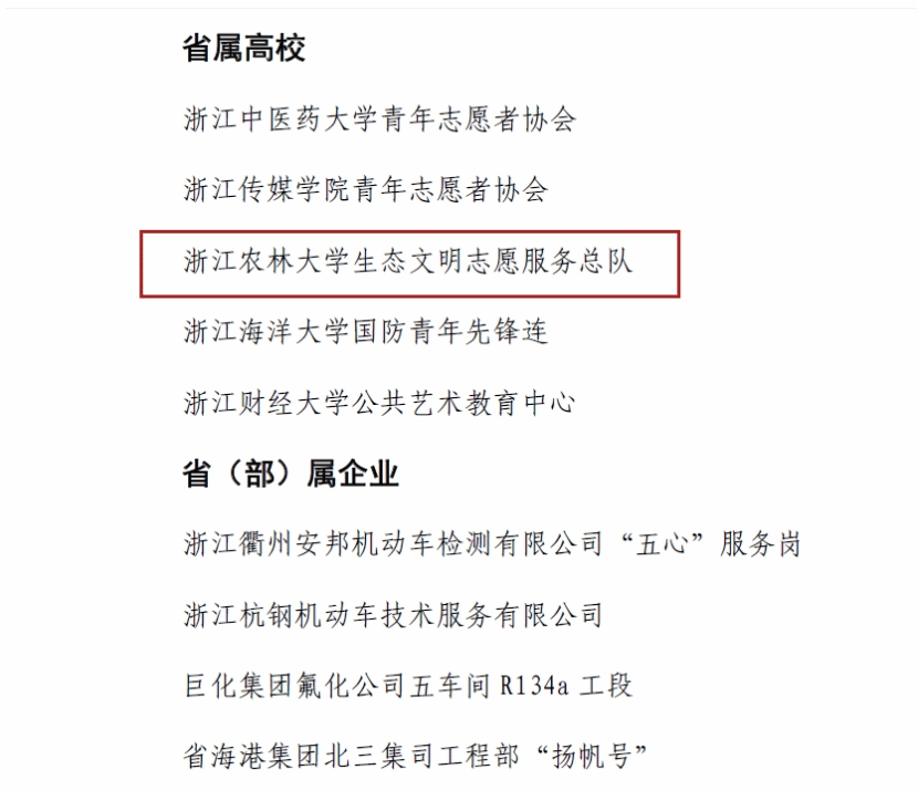 近日,浙江省“青年文明号、青年岗位能手”活动组委会发布了浙青文〔2022〕1 号文件,命名了2020-2021年度省青年文明号、青年岗位能手、青年安全生产示范岗,“浙江农林大学生态文明志愿服务总队”被授予“2020-2021年度省级青年文明号”,共有5所省属高校的相关单位入选省级青年文明号。